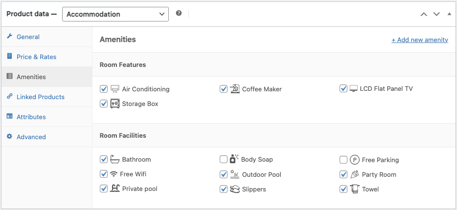Amenities refer to the various features and services that hotels provide to enhance the comfort and convenience of their guests. This plugin comes with two default groups of amenities (Room features and Room facilities), which can be expanded or completely modified.