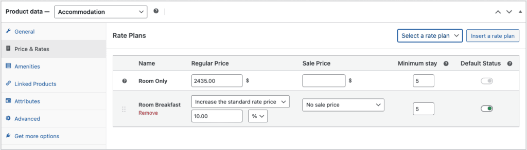 The next step is to establish the standard price for the default rate, and you may also set a sale price if applicable. If you have previously created custom rate plans, you can add them by selecting the desired rate plan and clicking the “Insert a rate plan” button.
