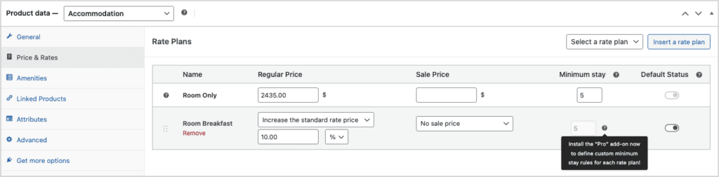 In this section, you can determine which rate plans will be utilized for this room and establish the base price for each plan. When you install and activate this plugin, a default rate plan is created. This default plan will automatically be assigned to every room.
